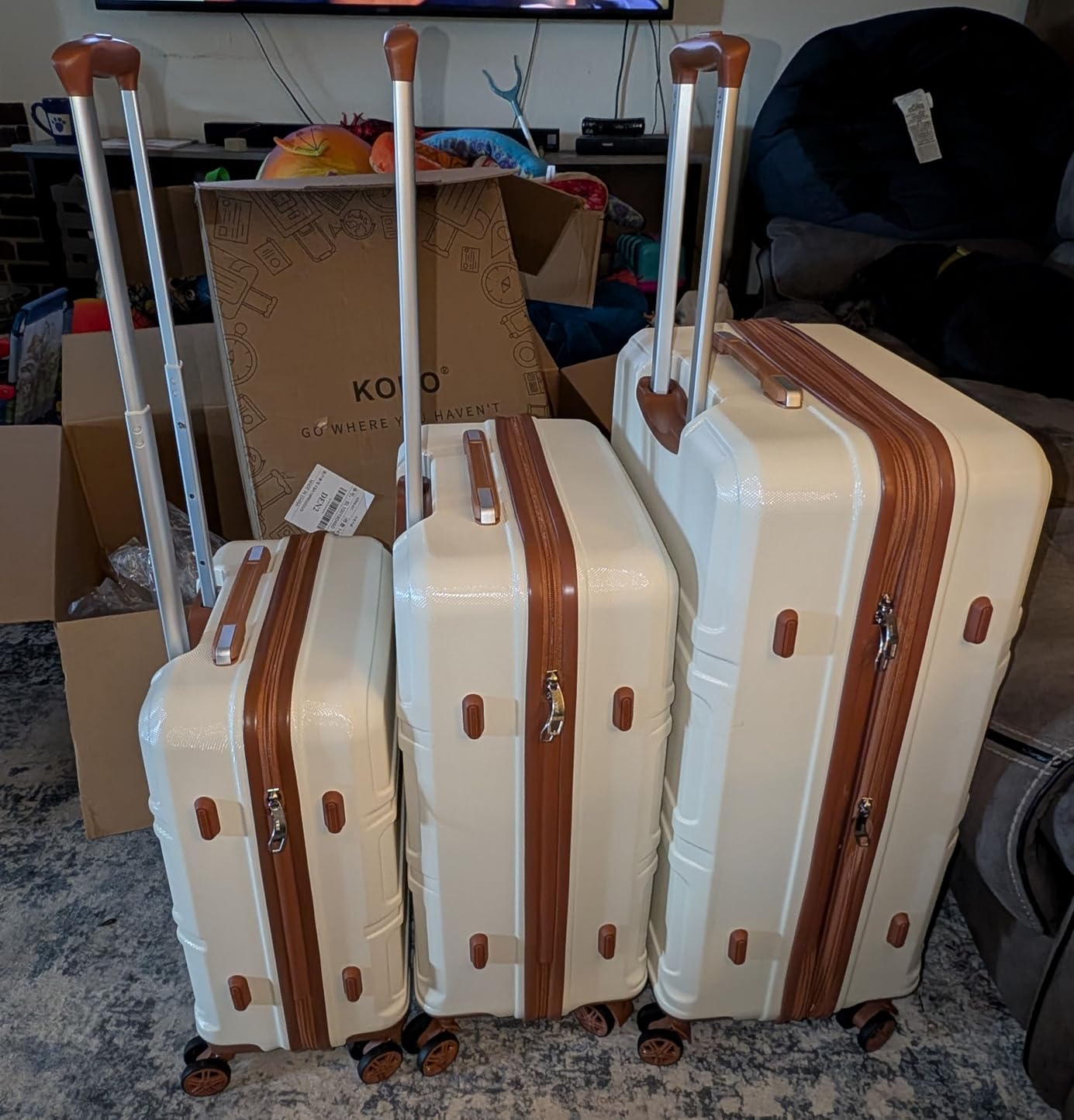 I havenāt had the chance to travel with my Kono luggage yet, but Iām already impressed. I got the white and brown set, and let me just sayāitās stunning. The design is sleek and modern. Just beautiful. The zippers glide smoothly, the handle feels sturdy, and the wheels roll like a dream across my floors. Even my carpet. Every bag has a TSA approved lock. It looks and feels much more high-end than the price suggests. Iāll definitely update after my first trip.