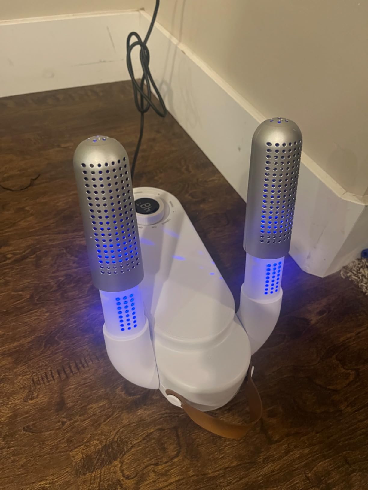 I really like the blue light. It heats up really nicely but not too hot. I like that you can fold it and put it away, because I do have taller boot dryer, which is pretty bulky and takes longer to dry the only thing I don’t really like about It is the fact that there is a sticker on it that is just for decoration, but I don’t think it was necessary.