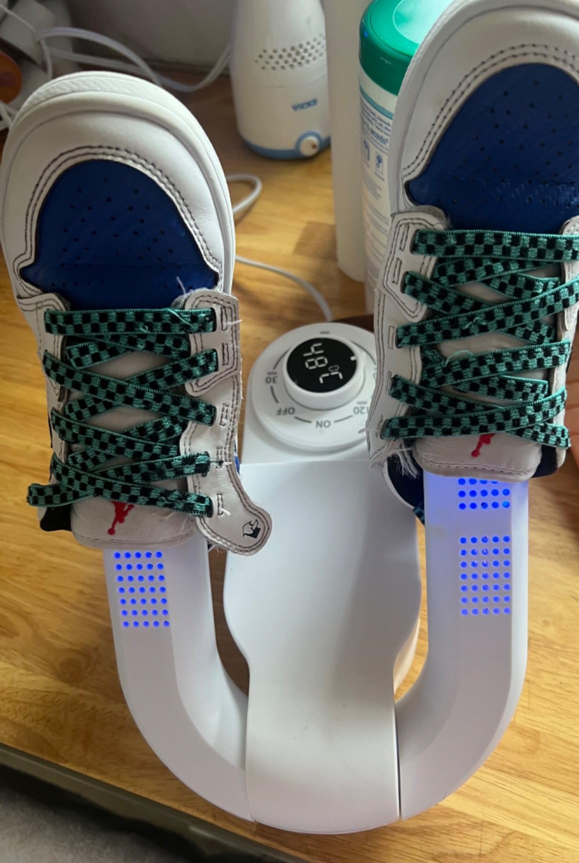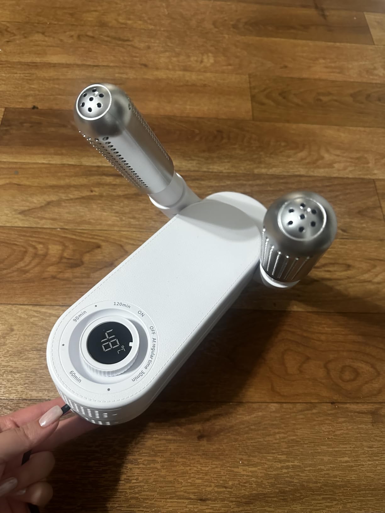 It dries my wet sneakers and gloves fast, and I like that it has a timer. Super easy to use and doesn’t take much space. Perfect for rainy days!