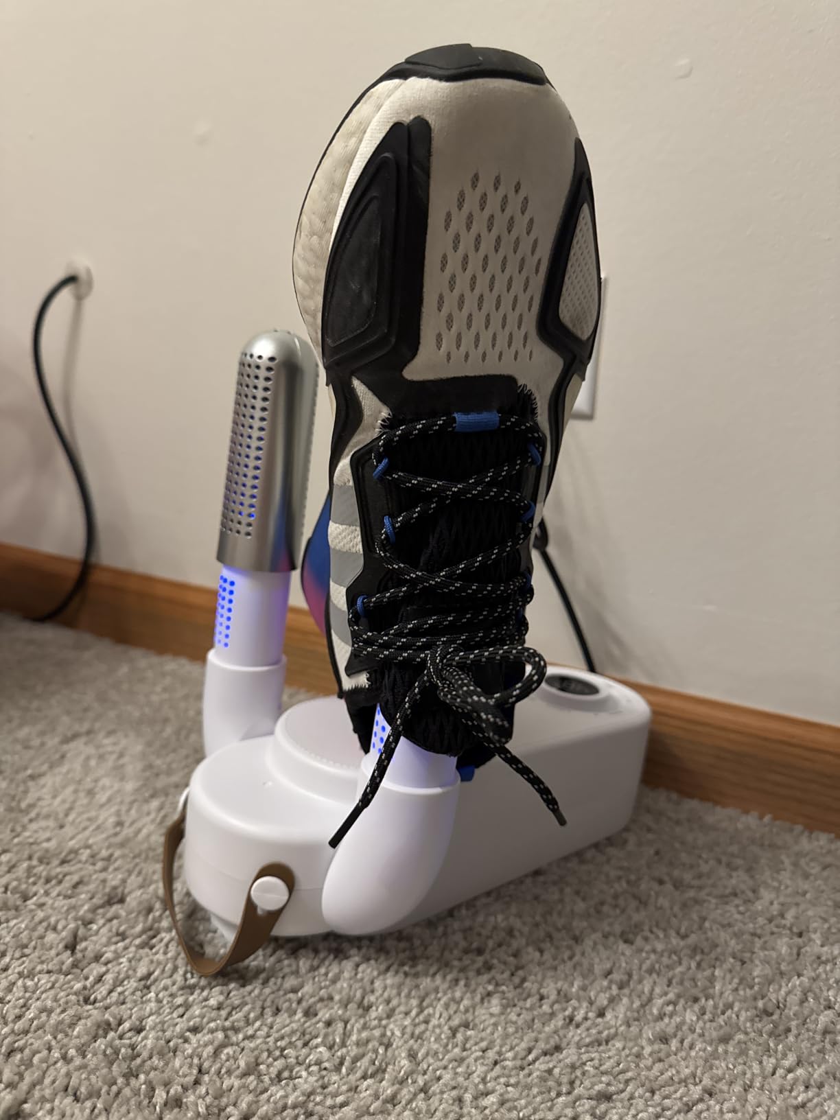 Dries your shoes, no more waiting around for forever or figuring out how to put them in the dryer. It has a timer which is very helpful and easy to set. It’s not loud whatsoever which is obviously great! Nice compact size too.